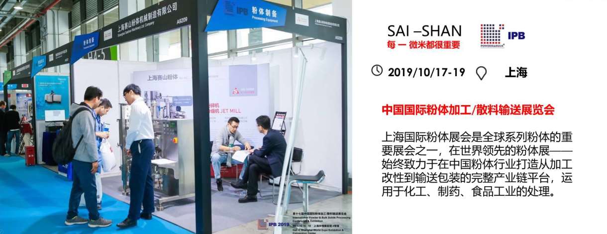 十七年來,IPB不斷發(fā)展壯大,已經(jīng)成為了中國(guó)粉體和散料領(lǐng)域中大的“一站式”展會(huì),為中外粉體行業(yè)相互交流與合作、企業(yè)與協(xié)會(huì)的交流與溝通搭建了平臺(tái),為企業(yè)拓展新業(yè)務(wù)、開發(fā)新市場(chǎng)提供了豐富的信息和商機(jī)。在世界領(lǐng)先的粉體展——德國(guó)POWTECH全力支持下,始終致力于在中國(guó)粉體行業(yè)打造從材料加工改性到輸送包裝的完整產(chǎn)業(yè)鏈平臺(tái),運(yùn)用于化工、制藥、食品工業(yè)的處理。賽山粉體此次攜帶實(shí)驗(yàn)室級(jí)三合一粉碎處理設(shè)備參展。