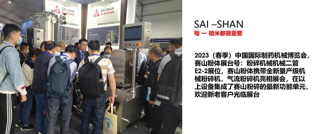 2023(春季)中國(guó)國(guó)際制藥機(jī)械博覽會(huì),賽山粉體展臺(tái)號(hào):粉碎機(jī)械機(jī)械二管E2-2展位,賽山粉體攜帶全新量產(chǎn)級(jí)機(jī)械粉碎機(jī),氣流粉碎機(jī)亮相展會(huì),在以上設(shè)備集成了賽山粉碎的比較新功能單元。